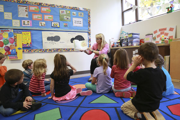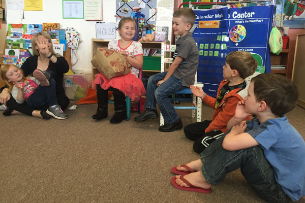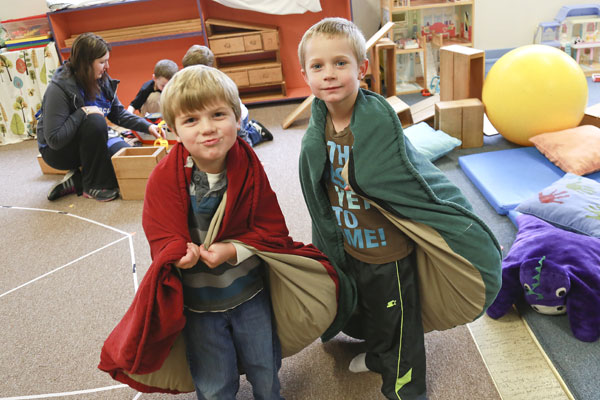 The capacity for Group C is 16 children. There are three working parents in this group in addition to the teacher. Our oldest class begins the day in a circle time that stretches the children’s ever-expanding attention spans. Their growing social skills are utilized in the practice of turn-taking, respectful listening, and peer acceptance. Group C participates in school-readiness center times that encompass and advance developmental goals. Also included in each school day are group times for story and music, snack, and outside play. In May, each student leaves with a portfolio representing their work throughout the year.